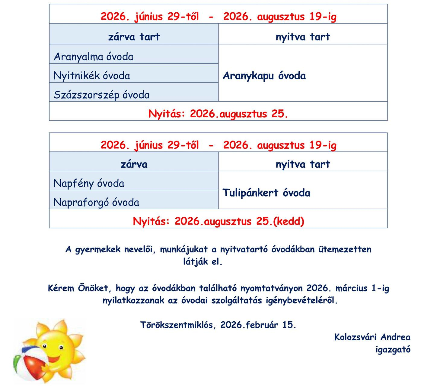 Közeleg az óvodai jelentkezés és beíratás ideje! A Törökszentmiklósi Óvodai Intézmény óvodáiban az alábbi időpontokban, nyílt, játékos délutánokat szervezünk, hogy megismerjék nevelőinket, nevelési programjainkat.